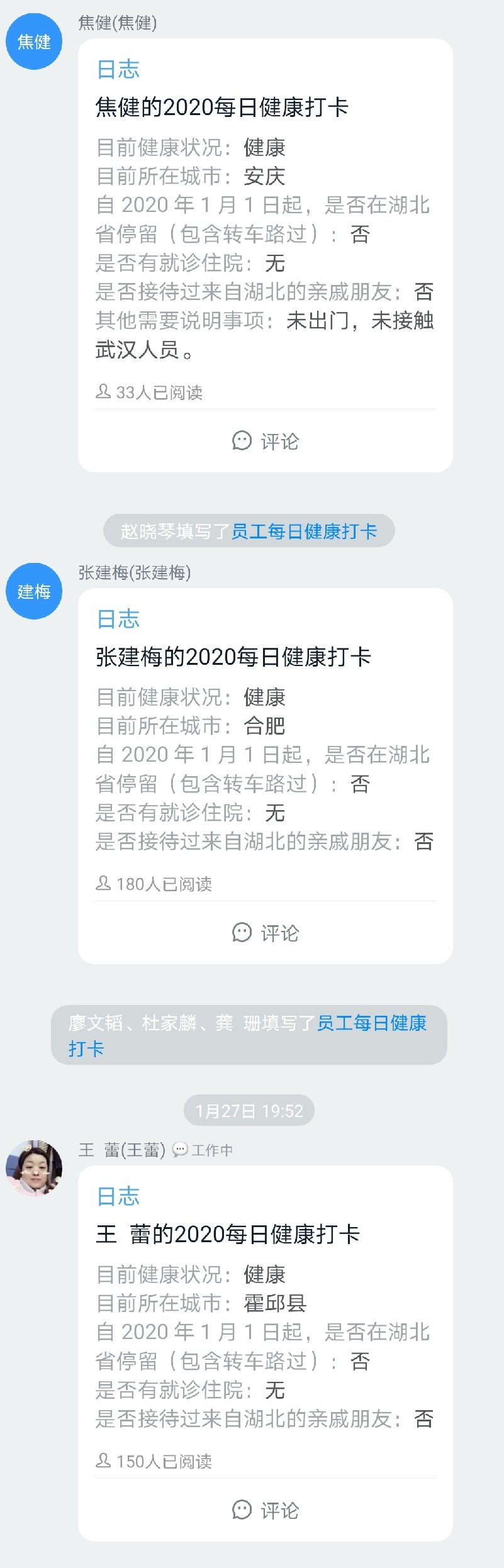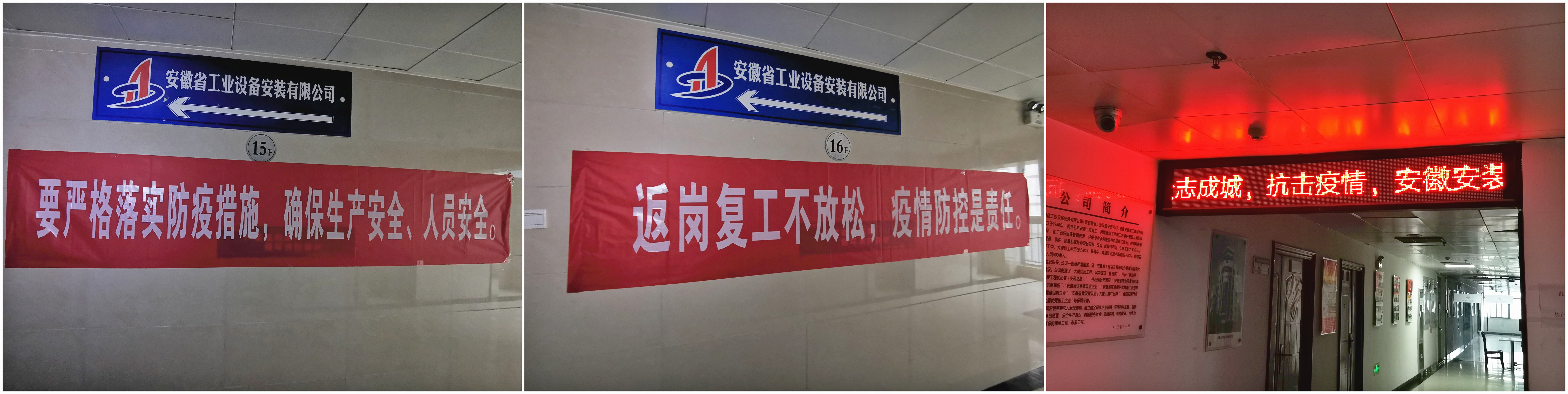 1月27日(大年初三),公司下發(fā)《安徽安裝公司關(guān)于做好新型冠狀病毒肺炎疫情工作的防控措施》,全體員工每日在釘釘日志專項報告當(dāng)日去向及身體狀況,各分公司、各部門認(rèn)真做好登記,確保信息及時準(zhǔn)確,時刻密切關(guān)注員工的身體健康狀況。