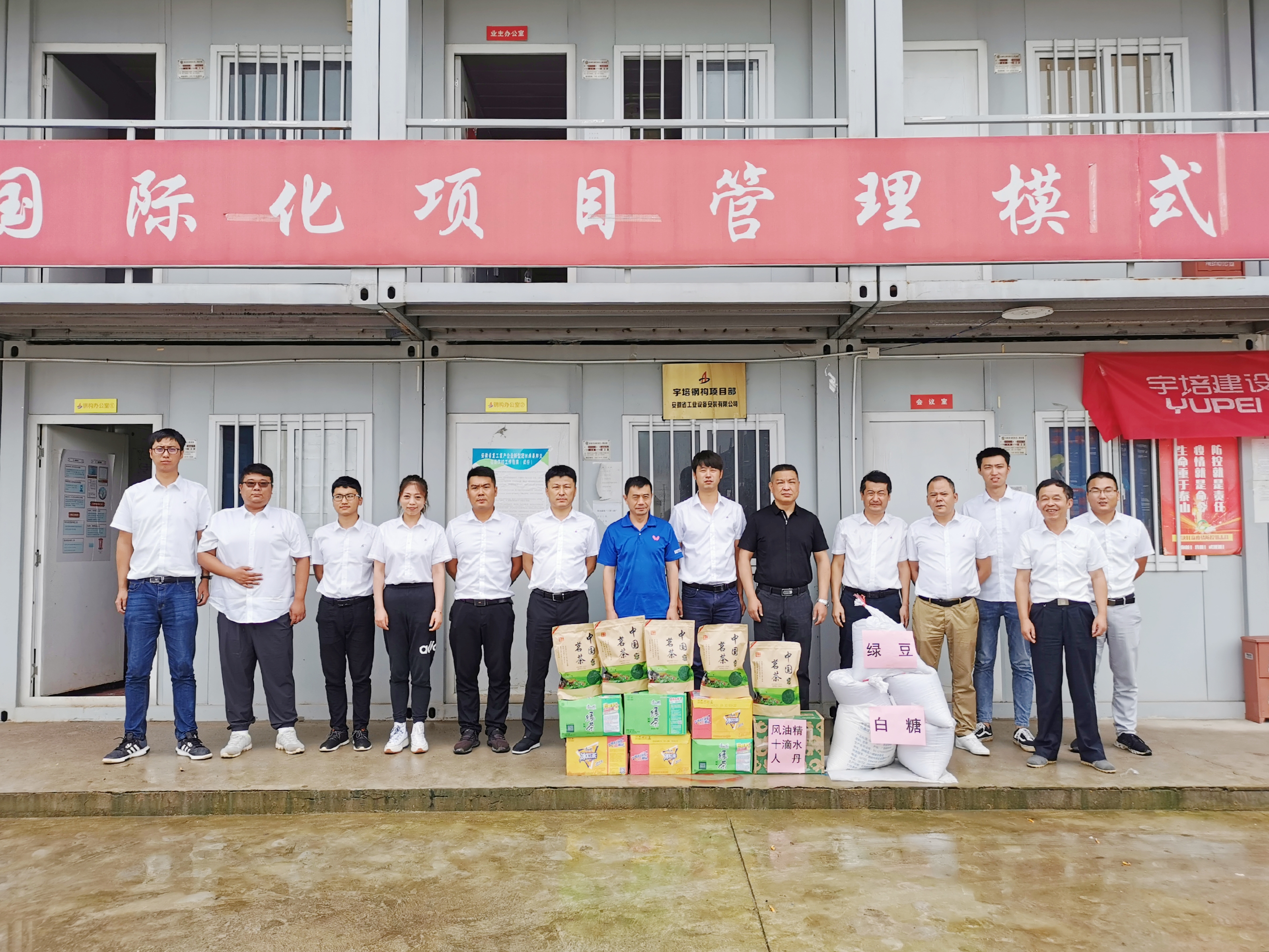 7月17日上午,公司領導走訪慰問了合肥分公司蕪湖宇培鋼結構項目部,為高溫天氣堅守在工作一線的項目部員工帶來了夏日防暑的常用藥品及飲料、綠豆、白糖、茶葉等。要求項目部堅持以人為本,一定要做好常態(tài)化疫情防控、防暑降溫、雨期安全工作,尤其是高溫、大風等極端天氣更要精心部署,合理安排作業(yè)內容,避開高溫時段施工,每日班前做好員工精神狀態(tài)確認,安全提醒到位,確保高溫季節(jié)一線職工安全度暑。