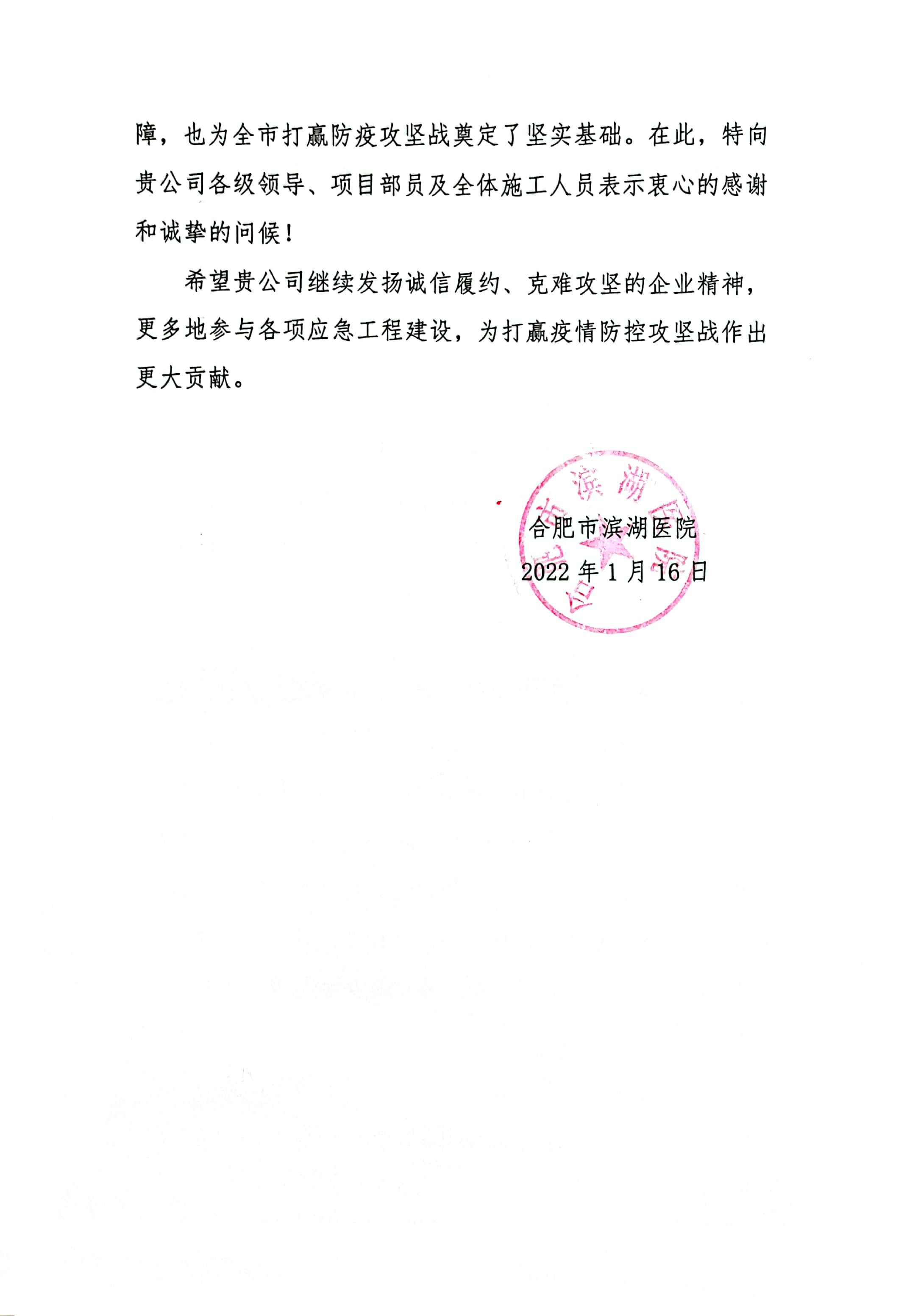 近日,安徽安裝公司收到合肥市濱湖醫(yī)院表揚信,信中高度贊揚公司濱湖醫(yī)院感染病區(qū)及發(fā)熱門診應急改造工程設計施工一體化方艙醫(yī)院項目克服重重困難,縮短工期,一個月的時間內(nèi)按期交付使用。該項目充分展現(xiàn)了安徽安裝作為國有企業(yè)擔當履責的社會責任,為合肥市打贏防疫攻堅戰(zhàn)奠定了堅實基礎。