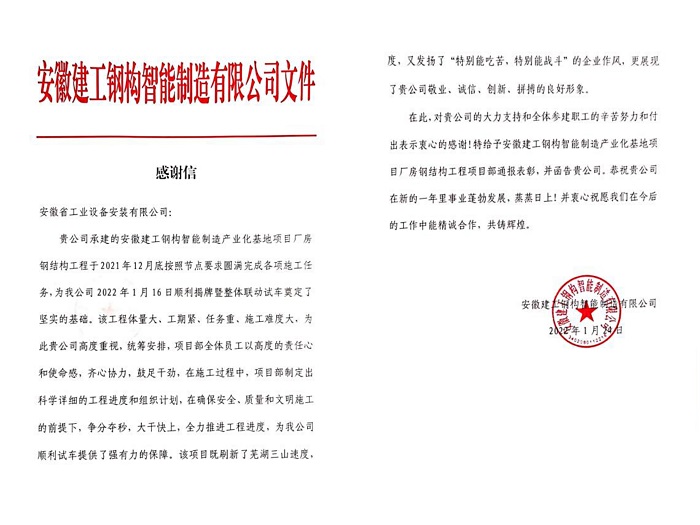 近日,公司安徽建工鋼構(gòu)智能制造有限公司廠房鋼結(jié)構(gòu)工程項(xiàng)目收到業(yè)主單位安徽建工鋼構(gòu)智能制造有限公司感謝信,信中對(duì)建工鋼構(gòu)廠房鋼結(jié)構(gòu)工程項(xiàng)目部在工程施工中的辛苦努力和突出表現(xiàn)表達(dá)了高度贊譽(yù)和衷心感謝!