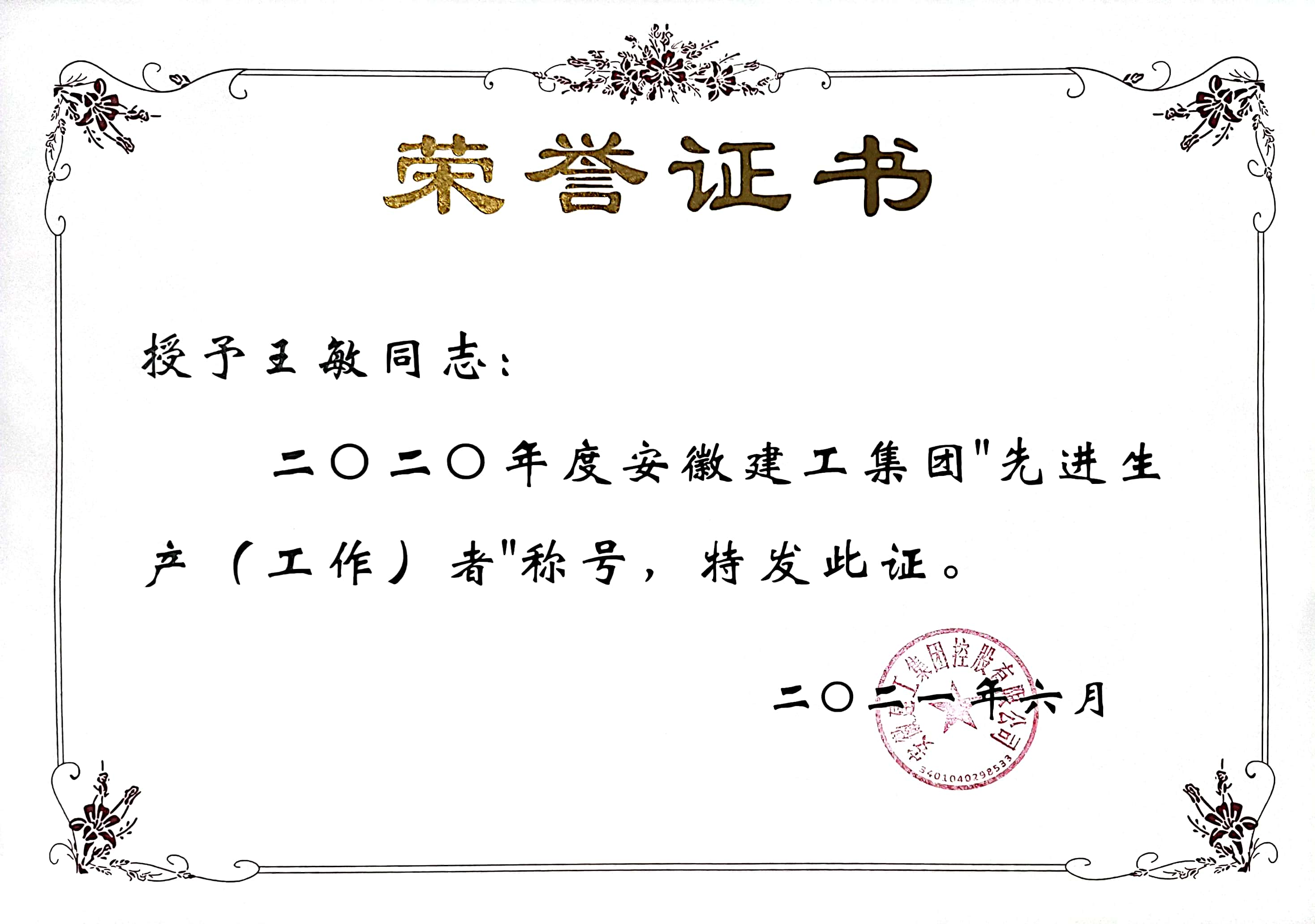 在工作作風(fēng)上,王敏一貫堅持對自己高標(biāo)準(zhǔn)嚴(yán)要求,腳踏實地,勤奮敬業(yè),認(rèn)真細(xì)致,勤于思考,盡心盡責(zé),主動、積極地做好每一項工作,認(rèn)真履行崗位職責(zé)。她時常告誡自己要以德服人,以身作則,并在實際工作中努力實踐著這一思想 ,注重自己的一言一行,公正、客觀,一切從大局出發(fā),不謀私利,不圖己便,廉潔自律,做到自重、自省、自警和自勵。2021年,王敏由于出色的工作成績,被評為“安徽建工集團2020年度先進(jìn)生產(chǎn)(工作)者”,她說,這是集團對她過去工作的肯定,也是對她未來工作的要求。