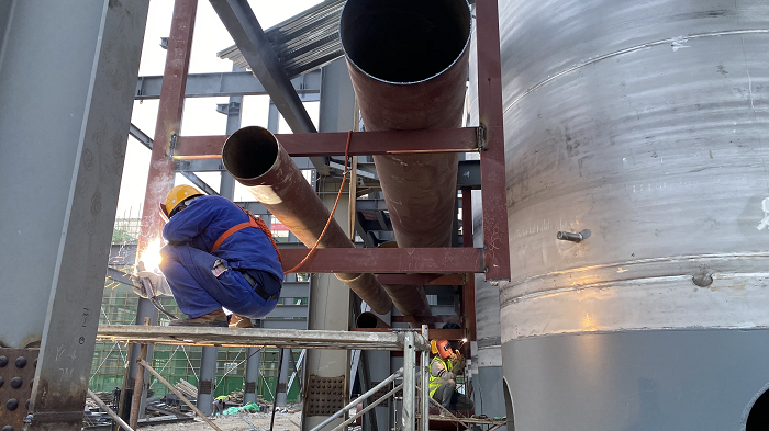 工藝管道班組也在忙忙碌碌,壓縮空氣管道在不斷架設(shè),料場(chǎng)加工好的管道在吊車、葫蘆的牽引下就位,專業(yè)的焊工進(jìn)行焊接,慢工出細(xì)活,保證每一道焊口符合規(guī)范要求,室外的循環(huán)水管也在與老廠的接口緊張對(duì)接。