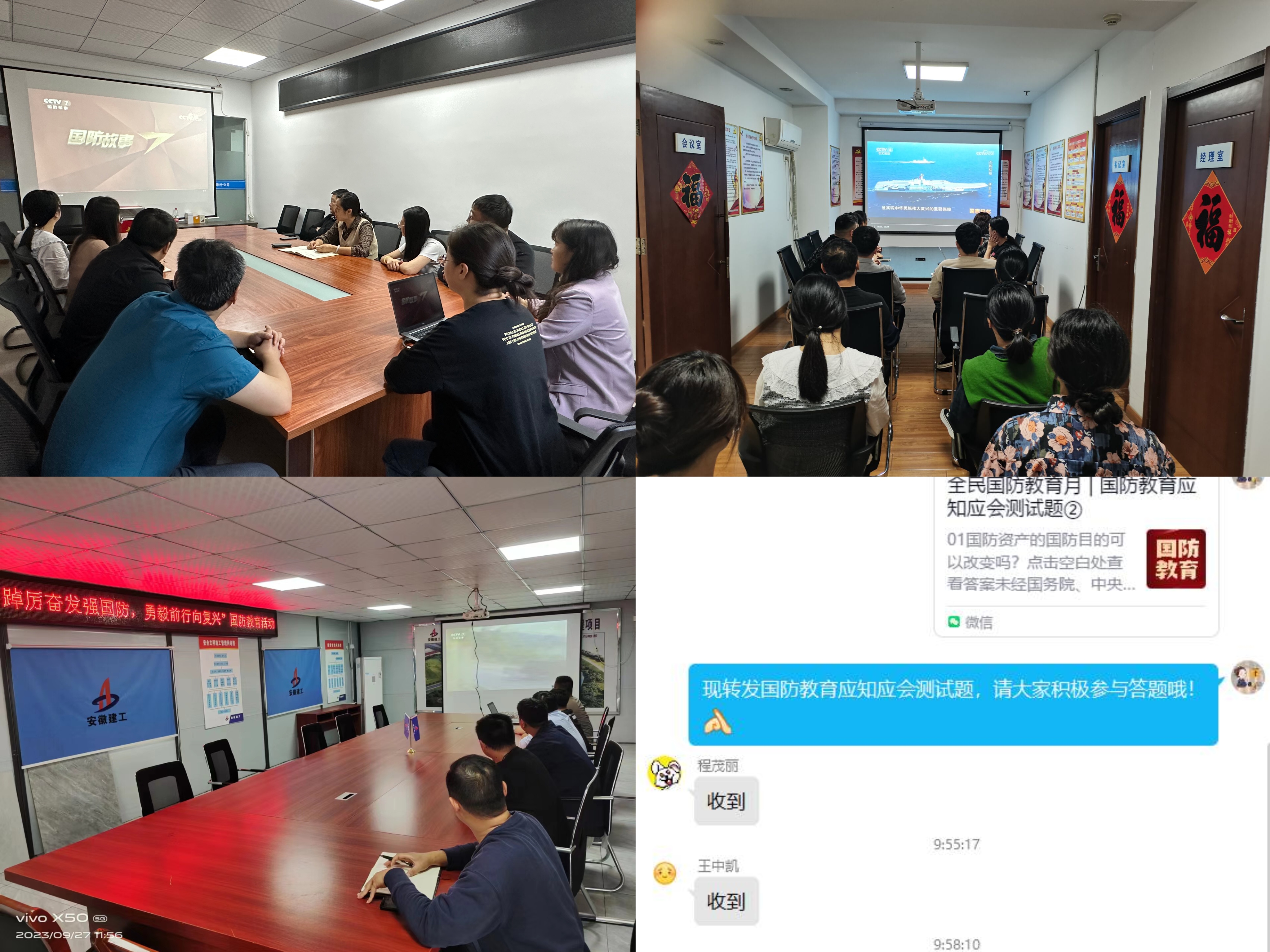公司各級(jí)黨組織通過中心組學(xué)習(xí)會(huì)、紅色教育實(shí)景課堂、退伍軍人職工座談交流、紅色觀影、國(guó)防知識(shí)問答等多種形式,營(yíng)造出關(guān)心國(guó)防、熱愛國(guó)防、建設(shè)國(guó)防、保衛(wèi)國(guó)防的濃厚氛圍,廣大職工紛紛表示要樹立國(guó)防觀念,賡續(xù)紅色血脈,立足崗位、恪盡職守、錘煉本領(lǐng),為推進(jìn)奮力開創(chuàng)安徽建工集團(tuán)大發(fā)展、轉(zhuǎn)型發(fā)展、高質(zhì)量發(fā)展新局面而不懈奮斗。