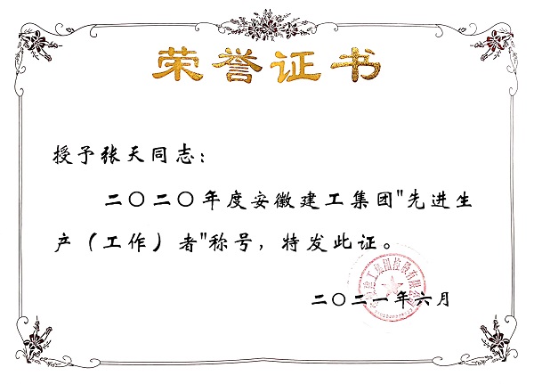 2017年5月,張?zhí)焱靖鶕?jù)工作需要遠(yuǎn)赴新疆烏蘇項(xiàng)目上,在不到兩年的時(shí)間內(nèi),嚴(yán)謹(jǐn)求實(shí),勤奮刻苦,兢兢業(yè)業(yè),時(shí)時(shí)處處嚴(yán)格要求自己,始終以飽滿的工作熱情、扎實(shí)的工作作風(fēng)、優(yōu)異的工作成績(jī),贏得了廣大員工的普遍好評(píng),榮獲2020年“建工集團(tuán)年度先進(jìn)生產(chǎn)(工作)者”稱(chēng)號(hào)。